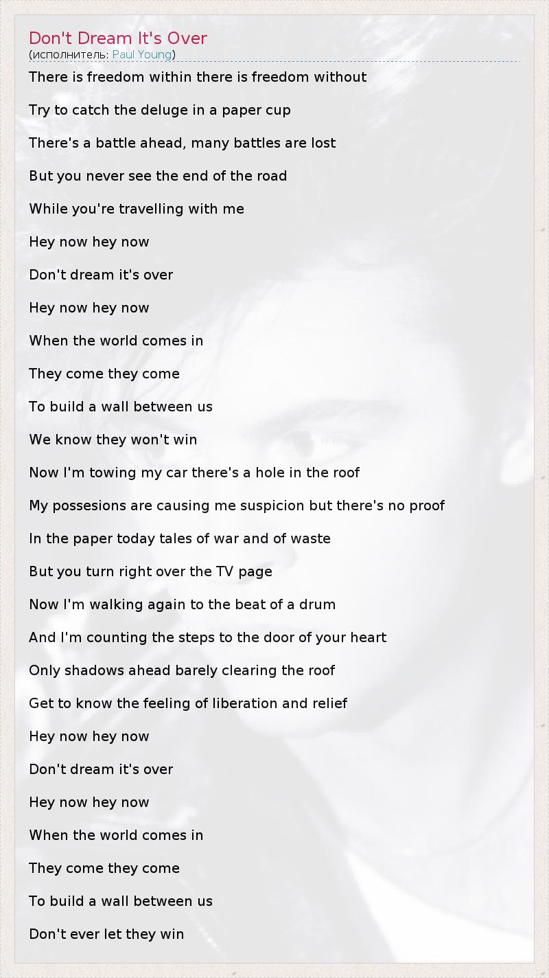 There is freedom within there is freedom without Try to catch the deluge in a paper cup There's a battle ahead, many battles are lost But you never see the end of the road While you're travelling with me Hey now hey now Don't dream it's over Hey now hey now When the world comes in They come they come To build a wall between us We know they won't win Now I'm towing my car there's a hole in the roof My possesions are causing me suspicion but there's no proof In the paper today tales of war and of waste But you turn right over the TV page Now I'm walking again to the beat of a drum And I'm counting the steps to the door of your heart Only shadows ahead barely clearing the roof Get to know the feeling of liberation and relief Hey now hey now Don't dream it's over Hey now hey now When the world comes in They come they come To build a wall between us Don't ever let they win