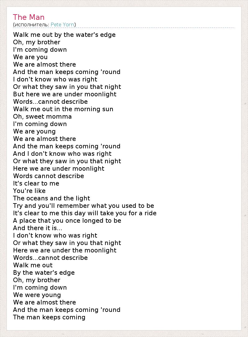 Walk me out by the water's edge Oh, my brother I'm coming down We are you We are almost there And the man keeps coming 'round I don't know who was right Or what they saw in you that night But here we are under moonlight Words...cannot describe Walk me out in the morning sun Oh, sweet momma I'm coming down We are young We are almost there And the man keeps coming 'round And I don't know who was right Or what they saw in you that night Here we are under moonlight Words cannot describe It's clear to me You're like The oceans and the light Try and you'll remember what you used to be It's clear to me this day will take you for a ride A place that you once longed to be And there it is... I don't know who was right Or what they saw in you that night Here we are under the moonlight Words...cannot describe Walk me out By the water's edge Oh, my brother I'm coming down We were young We are almost there And the man keeps coming 'round The man keeps coming