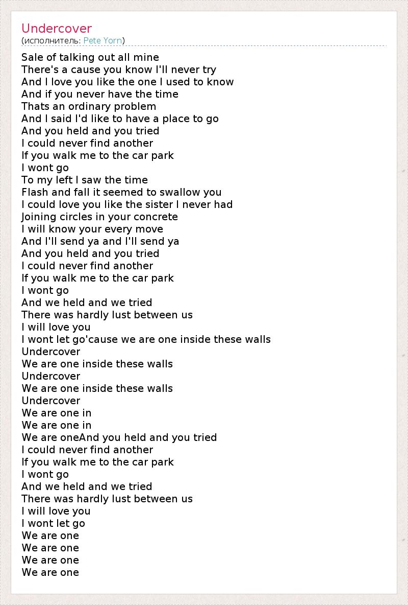 Sale of talking out all mine There's a cause you know I'll never try And I love you like the one I used to know And if you never have the time Thats an ordinary problem And I said I'd like to have a place to go And you held and you tried I could never find another If you walk me to the car park I wont go To my left I saw the time Flash and fall it seemed to swallow you I could love you like the sister I never had Joining circles in your concrete I will know your every move And I'll send ya and I'll send ya And you held and you tried I could never find another If you walk me to the car park I wont go And we held and we tried There was hardly lust between us I will love you I wont let go'cause we are one inside these walls Undercover We are one inside these walls Undercover We are one inside these walls Undercover We are one in We are one in We are oneAnd you held and you tried I could never find another If you walk me to the car park I wont go And we held and we tried There was hardly lust between us I will love you I wont let go We are one We are one We are one We are one