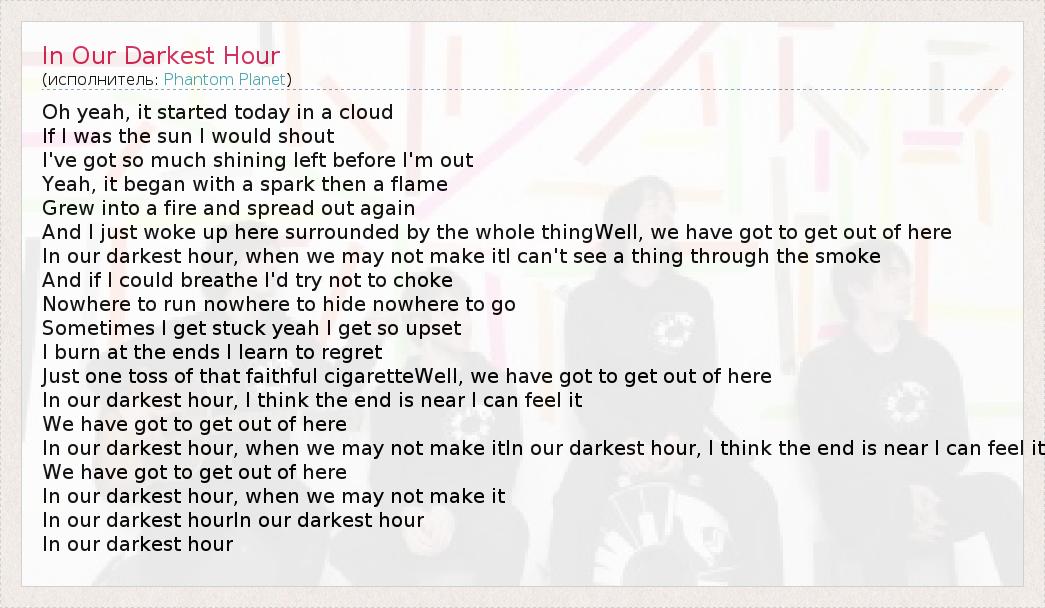 In our darkest hour, when we may not make itIn our darkest hour, I think the end is near I can feel it