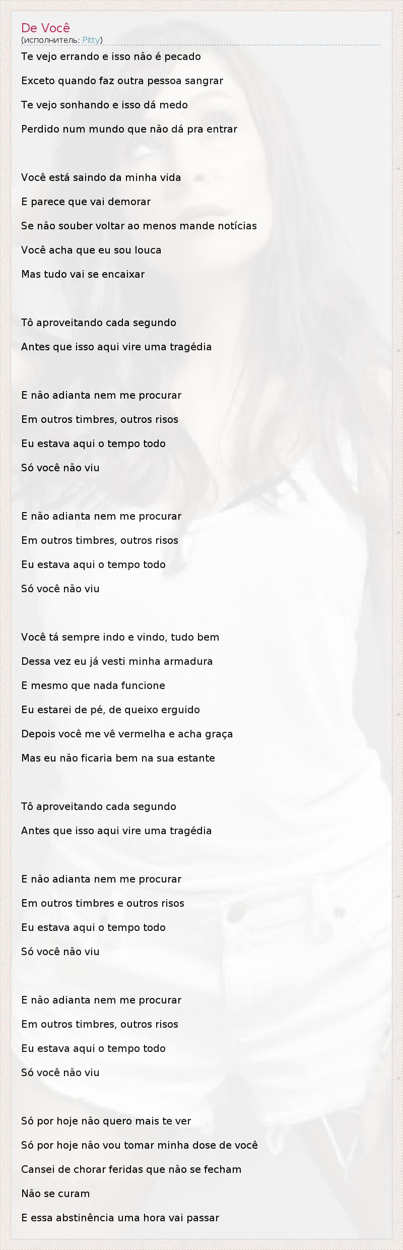 Te vejo errando e isso não é pecado Exceto quando faz outra pessoa sangrar Te vejo sonhando e isso dá medo Perdido num mundo que não dá pra entrar Você está saindo da minha vida E parece que vai demorar Se não souber voltar ao menos mande notícias Você acha que eu sou louca Mas tudo vai se encaixar Tô aproveitando cada segundo Antes que isso aqui vire uma tragédia E não adianta nem me procurar Em outros timbres, outros risos Eu estava aqui o tempo todo Só você não viu E não adianta nem me procurar Em outros timbres, outros risos Eu estava aqui o tempo todo Só você não viu Você tá sempre indo e vindo, tudo bem Dessa vez eu já vesti minha armadura E mesmo que nada funcione Eu estarei de pé, de queixo erguido Depois você me vê vermelha e acha graça Mas eu não ficaria bem na sua estante Tô aproveitando cada segundo Antes que isso aqui vire uma tragédia E não adianta nem me procurar Em outros timbres e outros risos Eu estava aqui o tempo todo Só você não viu E não adianta nem me procurar Em outros timbres, outros risos Eu estava aqui o tempo todo Só você não viu Só por hoje não quero mais te ver Só por hoje não vou tomar minha dose de você Cansei de chorar feridas que não se fecham Não se curam E essa abstinência uma hora vai passar
