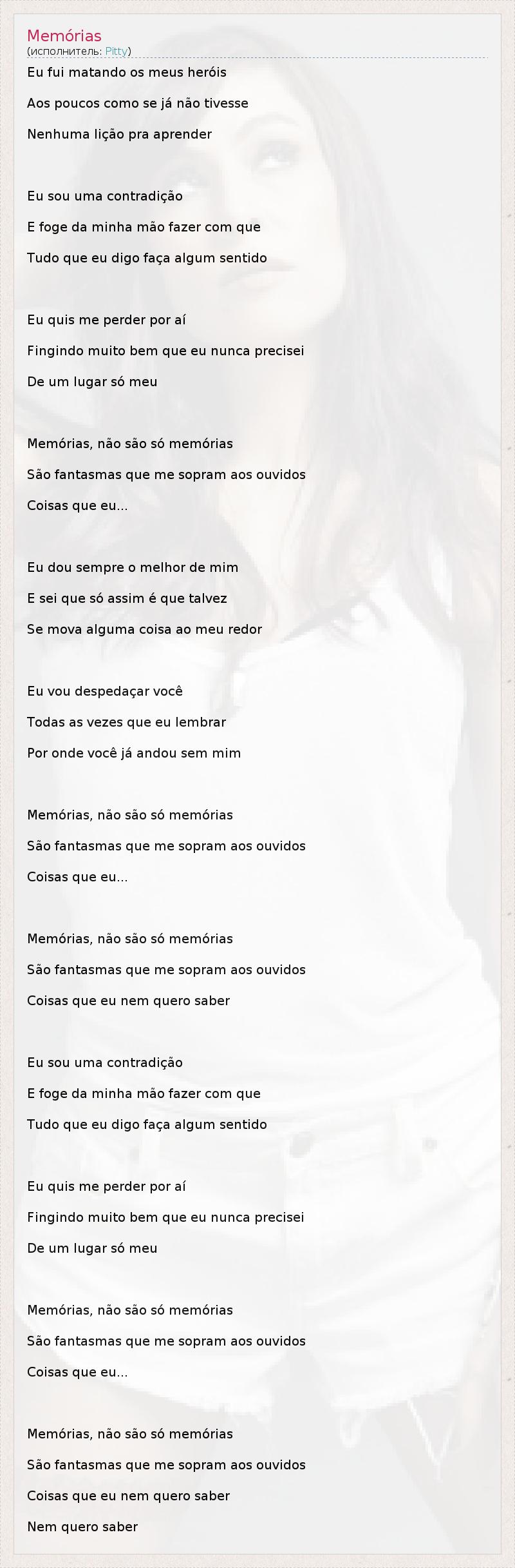 Это интересно:Присцилла Новис Леон - вот настоящее имя этой прекрасной девушки. Она популярна, красива и молода. Pitty - бразильская исполнительница альтернативного рока.Биография7 Октября 1977 года в Сальвадоре на свет появилось прекрасное дитя, которое родители назвали Присцилла. Это имя происходит от римского родового имени Priscus - "древний".Присси провела свое детство в Порто... продолжение