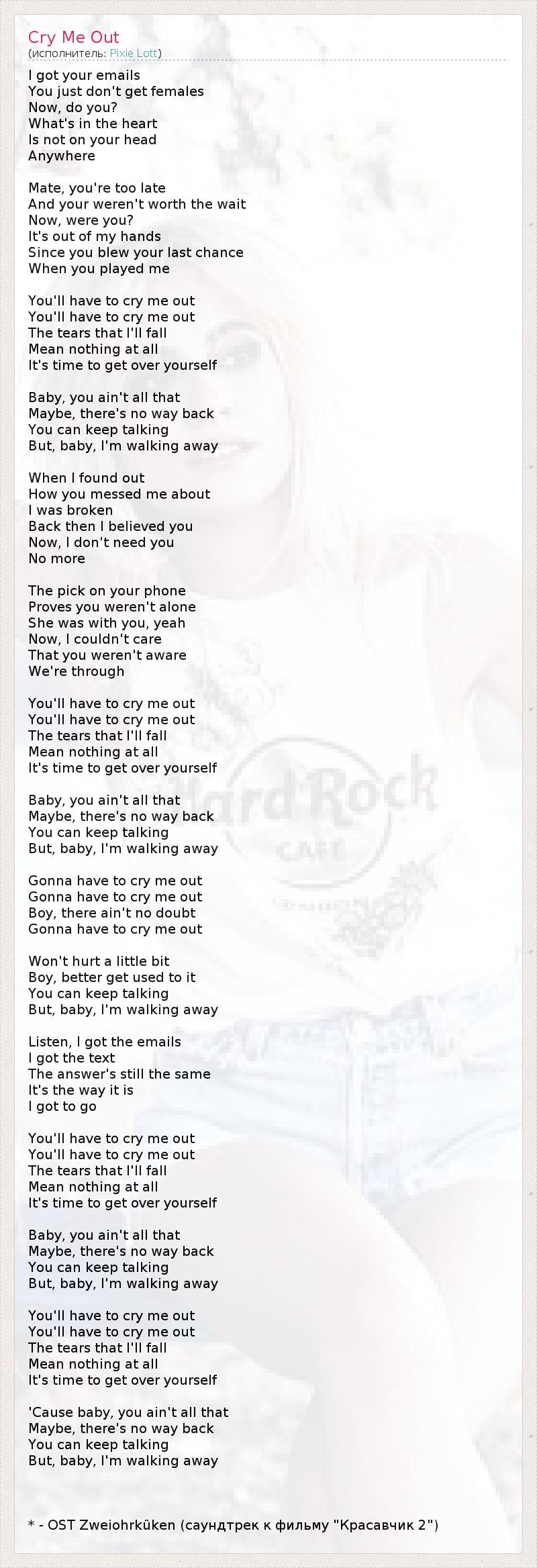 I got your emails You just don't get females Now, do you? What's in the heart Is not on your head Anywhere Mate, you're too late And your weren't worth the wait Now, were you? It's out of my hands Since you blew your last chance When you played me You'll have to cry me out You'll have to cry me out The tears that I'll fall Mean nothing at all It's time to get over yourself Baby, you ain't all that Maybe, there's no way back You can keep talking But, baby, I'm walking away When I found out How you messed me about I was broken Back then I believed you Now, I don't need you No more The pick on your phone Proves you weren't alone She was with you, yeah Now, I couldn't care That you weren't aware We're through You'll have to cry me out You'll have to cry me out The tears that I'll fall Mean nothing at all It's time to get over yourself Baby, you ain't all that Maybe, there's no way back You can keep talking But, baby, I'm walking away Gonna have to cry me out Gonna have to cry me out Boy, there ain't no doubt Gonna have to cry me out Won't hurt a little bit Boy, better get used to it You can keep talking But, baby, I'm walking away Listen, I got the emails I got the text The answer's still the same It's the way it is I got to go You'll have to cry me out You'll have to cry me out The tears that I'll fall Mean nothing at all It's time to get over yourself Baby, you ain't all that Maybe, there's no way back You can keep talking But, baby, I'm walking away You'll have to cry me out You'll have to cry me out The tears that I'll fall Mean nothing at all It's time to get over yourself 'Cause baby, you ain't all that Maybe, there's no way back You can keep talking But, baby, I'm walking away * - OST Zweiohrküken (саундтрек к фильму "Красавчик 2")