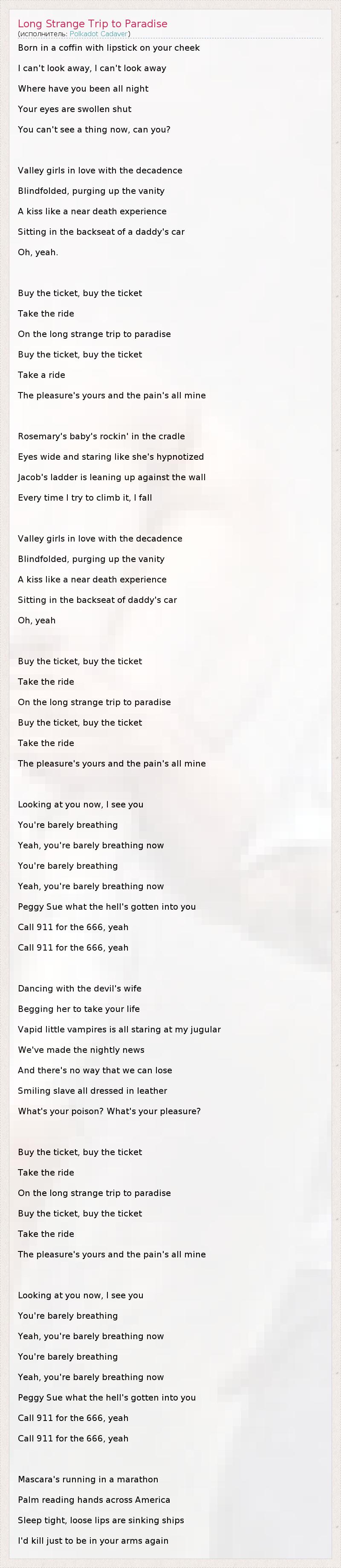 Born in a coffin with lipstick on your cheek I can't look away, I can't look away Where have you been all night Your eyes are swollen shut You can't see a thing now, can you? Valley girls in love with the decadence Blindfolded, purging up the vanity A kiss like a near death experience Sitting in the backseat of a daddy's car Oh, yeah. Buy the ticket, buy the ticket Take the ride On the long strange trip to paradise Buy the ticket, buy the ticket Take a ride The pleasure's yours and the pain's all mine Rosemary's baby's rockin' in the cradle Eyes wide and staring like she's hypnotized Jacob's ladder is leaning up against the wall Every time I try to climb it, I fall Valley girls in love with the decadence Blindfolded, purging up the vanity A kiss like a near death experience Sitting in the backseat of daddy's car Oh, yeah Buy the ticket, buy the ticket Take the ride On the long strange trip to paradise Buy the ticket, buy the ticket Take the ride The pleasure's yours and the pain's all mine Looking at you now, I see you You're barely breathing Yeah, you're barely breathing now You're barely breathing Yeah, you're barely breathing now Peggy Sue what the hell's gotten into you Call 911 for the 666, yeah Call 911 for the 666, yeah Dancing with the devil's wife Begging her to take your life Vapid little vampires is all staring at my jugular We've made the nightly news And there's no way that we can lose Smiling slave all dressed in leather What's your poison? What's your pleasure? Buy the ticket, buy the ticket Take the ride On the long strange trip to paradise Buy the ticket, buy the ticket Take the ride The pleasure's yours and the pain's all mine Looking at you now, I see you You're barely breathing Yeah, you're barely breathing now You're barely breathing Yeah, you're barely breathing now Peggy Sue what the hell's gotten into you Call 911 for the 666, yeah Call 911 for the 666, yeah Mascara's running in a marathon Palm reading hands across America Sleep tight, loose lips are sinking ships I'd kill just to be in your arms again