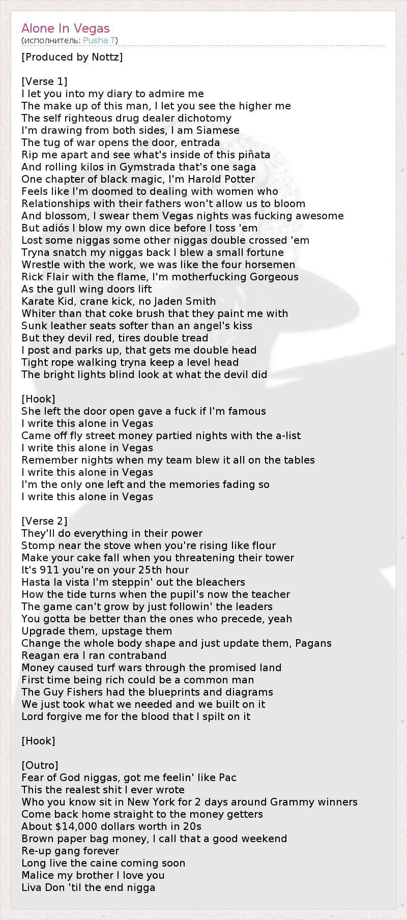 [Produced by Nottz] [Verse 1] I let you into my diary to admire me The make up of this man, I let you see the higher me The self righteous drug dealer dichotomy I'm drawing from both sides, I am Siamese The tug of war opens the door, entrada Rip me apart and see what's inside of this piñata And rolling kilos in Gymstrada that's one saga One chapter of black magic, I'm Harold Potter Feels like I'm doomed to dealing with women who Relationships with their fathers won't allow us to bloom And blossom, I swear them Vegas nights was fucking awesome But adiós I blow my own dice before I toss 'em Lost some niggas some other niggas double crossed 'em Tryna snatch my niggas back I blew a small fortune Wrestle with the work, we was like the four horsemen Rick Flair with the flame, I'm motherfucking Gorgeous As the gull wing doors lift Karate Kid, crane kick, no Jaden Smith Whiter than that coke brush that they paint me with Sunk leather seats softer than an angel's kiss But they devil red, tires double tread I post and parks up, that gets me double head Tight rope walking tryna keep a level head The bright lights blind look at what the devil did [Hook] She left the door open gave a fuck if I'm famous I write this alone in Vegas Came off fly street money partied nights with the a-list I write this alone in Vegas Remember nights when my team blew it all on the tables I write this alone in Vegas I'm the only one left and the memories fading so I write this alone in Vegas [Verse 2] They'll do everything in their power Stomp near the stove when you're rising like flour Make your cake fall when you threatening their tower It's 911 you're on your 25th hour Hasta la vista I'm steppin' out the bleachers How the tide turns when the pupil's now the teacher The game can't grow by just followin' the leaders You gotta be better than the ones who precede, yeah Upgrade them, upstage them Change the whole body shape and just update them, Pagans Reagan era I ran contraband Money caused turf wars through the promised land First time being rich could be a common man The Guy Fishers had the blueprints and diagrams We just took what we needed and we built on it Lord forgive me for the blood that I spilt on it [Hook] [Outro] Fear of God niggas, got me feelin' like Pac This the realest shit I ever wrote Who you know sit in New York for 2 days around Grammy winners Come back home straight to the money getters About $14,000 dollars worth in 20s Brown paper bag money, I call that a good weekend Re-up gang forever Long live the caine coming soon Malice my brother I love you Liva Don 'til the end nigga