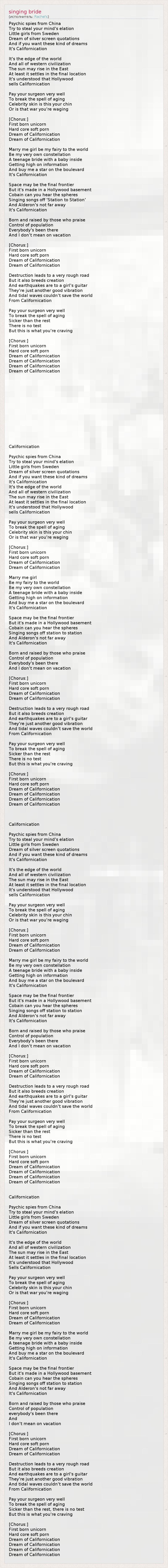 Psychic spies from China Try to steal your mind's elation Little girls from Sweden Dream of silver screen quotations And if you want these kind of dreams It's Californication It's the edge of the world And all of western civilization The sun may rise in the East At least it settles in the final location It's understood that Hollywood sells Californication Pay your surgeon very well To break the spell of aging Celebrity skin is this your chin Or is that war you're waging [Chorus:] First born unicorn Hard core soft porn Dream of Californication Dream of Californication Marry me girl be my fairy to the world Be my very own constellation A teenage bride with a baby inside Getting high on information And buy me a star on the boulevard It's Californication Space may be the final frontier But it's made in a Hollywood basement Cobain can you hear the spheres Singing songs off 'Station to Station' And Alderon's not far away It's Californication Born and raised by those who praise Control of population Everybody's been there And I don't mean on vacation [Chorus:] First born unicorn Hard core soft porn Dream of Californication Dream of Californication Destruction leads to a very rough road But it also breeds creation And earthquakes are to a girl's guitar They're just another good vibration And tidal waves couldn't save the world From Californication Pay your surgeon very well To break the spell of aging Sicker than the rest There is no test But this is what you're craving [Chorus:] First born unicorn Hard core soft porn Dream of Californication Dream of Californication Dream of Californication Dream of Californication Californication Psychic spies from China Try to steal your mind's elation Little girls from Sweden Dream of silver screen quotations And if you want these kind of dreams It's Californication It's the edge of the world And all of western civilization The sun may rise in the East At least it settles in the final location It's understood that Hollywood sells Californication Pay your surgeon very well To break the spell of aging Celebrity skin is this your chin Or is that war you're waging [Chorus:] First born unicorn Hard core soft porn Dream of Californication Dream of Californication Marry me girl Be my fairy to the world Be my very own constellation A teenage bride with a baby inside Getting high on information And buy me a star on the boulevard It's Californication Space may be the final frontier But it's made in a Hollywood basement Cobain can you hear the spheres Singing songs off station to station And Alderon's not far away It's Californication Born and raised by those who praise Control of population Everybody's been there And I don't mean on vacation [Chorus:] First born unicorn Hard core soft porn Dream of Californication Dream of Californication Destruction leads to a very rough road But it also breeds creation And earthquakes are to a girl's guitar They're just another good vibration And tidal waves couldn't save the world From Californication Pay your surgeon very well To break the spell of aging Sicker than the rest There is no test But this is what you're craving [Chorus:] First born unicorn Hard core soft porn Dream of Californication Dream of Californication Dream of Californication Dream of Californication Californication Psychic spies from China Try to steal your mind's elation Little girls from Sweden Dream of silver screen quotations And if you want these kind of dreams It's Californication It's the edge of the world And all of western civilization The sun may rise in the East At least it settles in the final location It's understood that Hollywood sells Californication Pay your surgeon very well To break the spell of aging Celebrity skin is this your chin Or is that war you're waging [Chorus:] First born unicorn Hard core soft porn Dream of Californication Dream of Californication Marry me girl be my fairy to the world Be my very own constellation A teenage bride with a baby inside Getting high on information And buy me a star on the boulevard It's Californication Space may be the final frontier But it's made in a Hollywood basement Cobain can you hear the spheres Singing songs off station to station And Alderon's not far away It's Californication Born and raised by those who praise Control of population Everybody's been there And I don't mean on vacation [Chorus:] First born unicorn Hard core soft porn Dream of Californication Dream of Californication Destruction leads to a very rough road But it also breeds creation And earthquakes are to a girl's guitar They're just another good vibration And tidal waves couldn't save the world From Californication Pay your surgeon very well To break the spell of aging Sicker than the rest There is no test But this is what you're craving [Chorus:] First born unicorn Hard core soft porn Dream of Californication Dream of Californication Dream of Californication Dream of Californication Californication Psychic spies from China Try to steal your mind's elation Little girls from Sweden Dream of silver screen quotations And if you want these kind of dreams It's Californication It's the edge of the world And all of western civilization The sun may rise in the East At least it settles in the final location It's understood that Hollywood Sells Californication Pay your surgeon very well To break the spell of aging Celebrity skin is this your chin Or is that war you're waging [Chorus:] First born unicorn Hard core soft porn Dream of Californication Dream of Californication Marry me girl be my fairy to the world Be my very own constellation A teenage bride with a baby inside Getting high on information And buy me a star on the boulevard It's Californication Space may be the final frontier But it's made in a Hollywood basement Cobain can you hear the spheres Singing songs off station to station And Alderon's not far away It's Californication Born and raised by those who praise Control of population everybody's been there And I don't mean on
