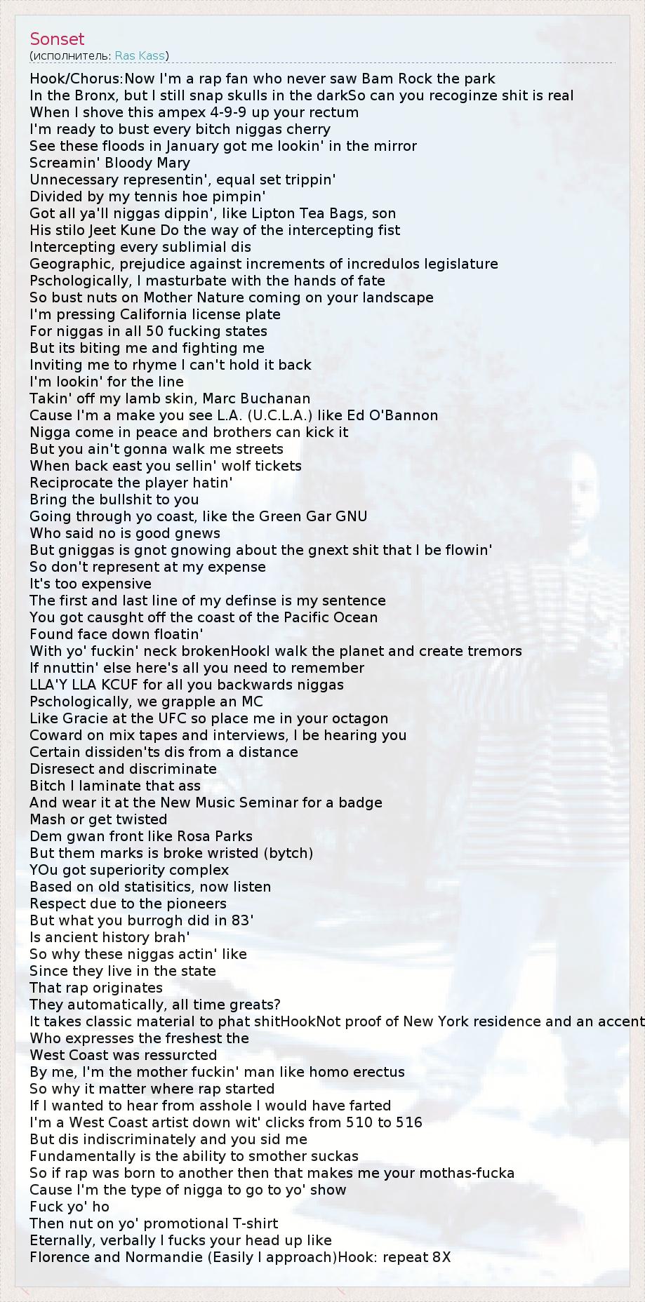 Hook/Chorus:Now I'm a rap fan who never saw Bam Rock the park In the Bronx, but I still snap skulls in the darkSo can you recoginze shit is real When I shove this ampex 4-9-9 up your rectum I'm ready to bust every bitch niggas cherry See these floods in January got me lookin' in the mirror Screamin' Bloody Mary Unnecessary representin', equal set trippin' Divided by my tennis hoe pimpin' Got all ya'll niggas dippin', like Lipton Tea Bags, son His stilo Jeet Kune Do the way of the intercepting fist Intercepting every sublimial dis Geographic, prejudice against increments of incredulos legislature Pschologically, I masturbate with the hands of fate So bust nuts on Mother Nature coming on your landscape I'm pressing California license plate For niggas in all 50 fucking states But its biting me and fighting me Inviting me to rhyme I can't hold it back I'm lookin' for the line Takin' off my lamb skin, Marc Buchanan Cause I'm a make you see L.A. (U.C.L.A.) like Ed O'Bannon Nigga come in peace and brothers can kick it But you ain't gonna walk me streets When back east you sellin' wolf tickets Reciprocate the player hatin' Bring the bullshit to you Going through yo coast, like the Green Gar GNU Who said no is good gnews But gniggas is gnot gnowing about the gnext shit that I be flowin' So don't represent at my expense It's too expensive The first and last line of my definse is my sentence You got causght off the coast of the Pacific Ocean Found face down floatin' With yo' fuckin' neck brokenHookI walk the planet and create tremors If nnuttin' else here's all you need to remember LLA'Y LLA KCUF for all you backwards niggas Pschologically, we grapple an MC Like Gracie at the UFC so place me in your octagon Coward on mix tapes and interviews, I be hearing you Certain dissiden'ts dis from a distance Disresect and discriminate Bitch I laminate that ass And wear it at the New Music Seminar for a badge Mash or get twisted Dem gwan front like Rosa Parks But them marks is broke wristed (bytch) YOu got superiority complex Based on old statisitics, now listen Respect due to the pioneers But what you burrogh did in 83' Is ancient history brah' So why these niggas actin' like Since they live in the state That rap originates They automatically, all time greats? It takes classic material to phat shitHookNot proof of New York residence and an accent Who expresses the freshest the West Coast was ressurcted By me, I'm the mother fuckin' man like homo erectus So why it matter where rap started If I wanted to hear from asshole I would have farted I'm a West Coast artist down wit' clicks from 510 to 516 But dis indiscriminately and you sid me Fundamentally is the ability to smother suckas So if rap was born to another then that makes me your mothas-fucka Cause I'm the type of nigga to go to yo' show Fuck yo' ho Then nut on yo' promotional T-shirt Eternally, verbally I fucks your head up like Florence and Normandie (Easily I approach)Hook: repeat 8X