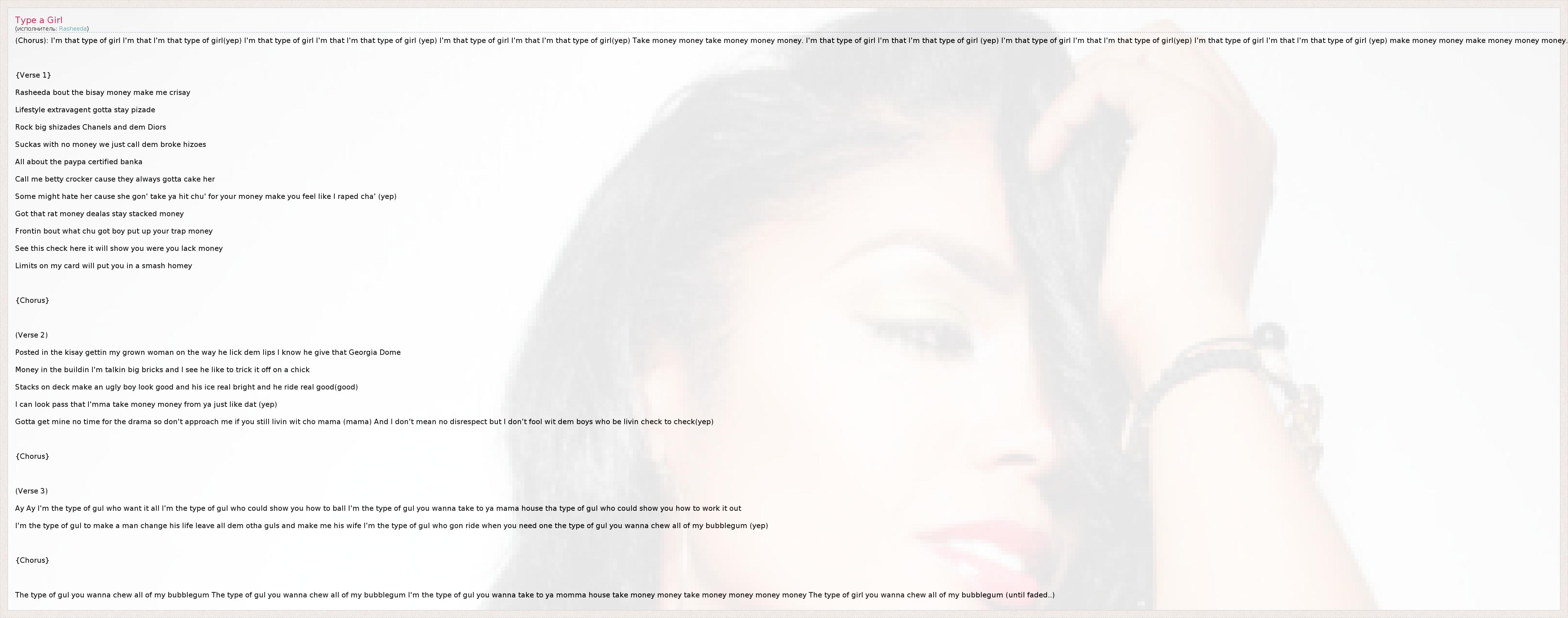 The type of gul you wanna chew all of my bubblegum The type of gul you wanna chew all of my bubblegum I'm the type of gul you wanna take to ya momma house take money money take money money money money The type of girl you wanna chew all of my bubblegum (until faded..)