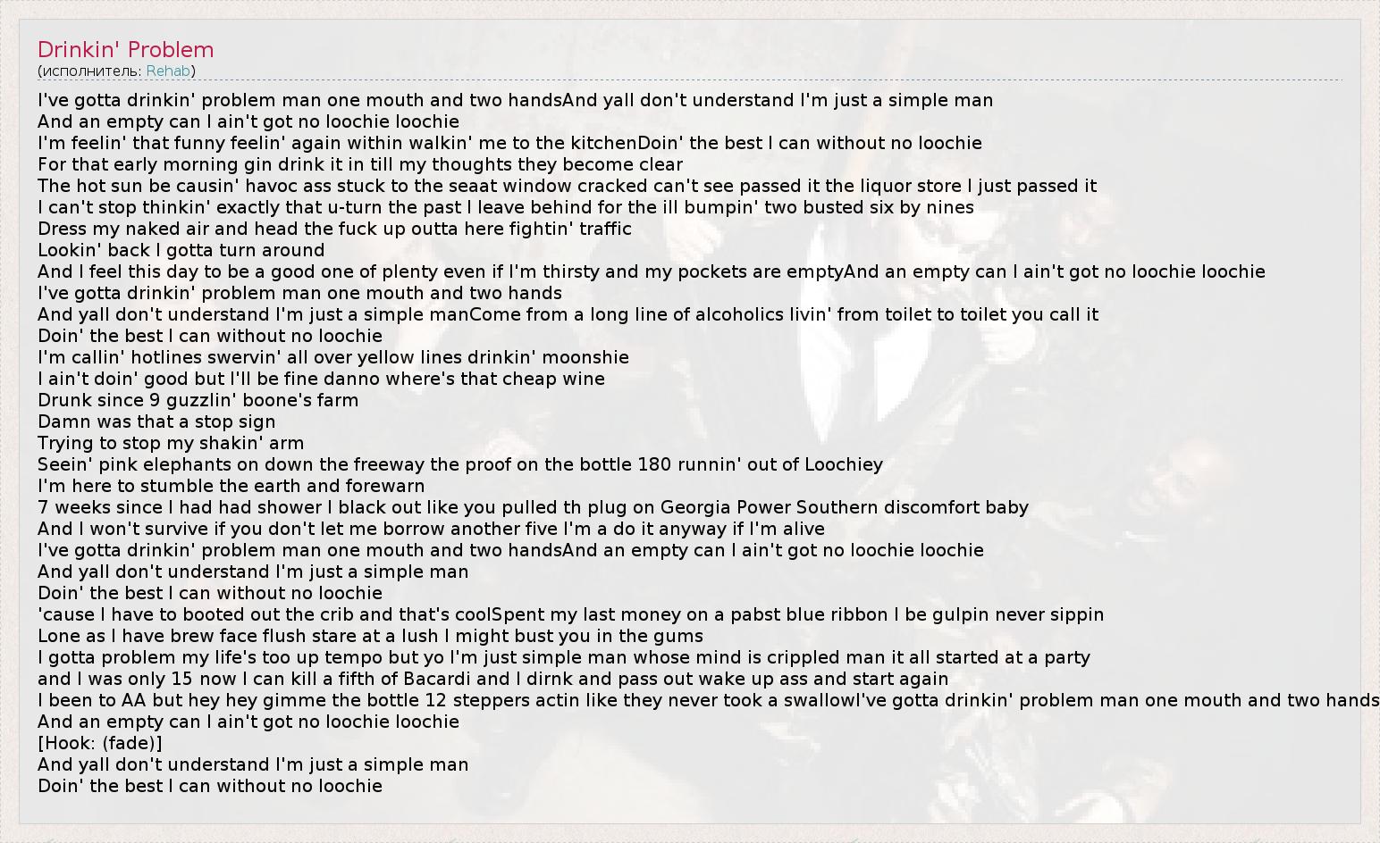 А как ты думаешь, о чем песня "Drinkin' Problem" ?