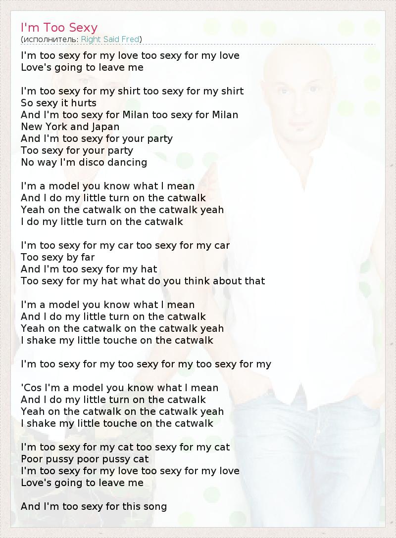 Я слишком сексуален для моей любимой, слишком сексуален для моей любимой. Скоро любимая бросит меня. Я слишком сексуален для своей рубашки, слишком сексуален для своей рубашки, Настолько сексуален, что даже больно. И я слишком сексуален для Милана, слишком сексуален для Милана, Нью-Йорка и Японии. Я слишком сексуален для вашей вечеринки, Слишком сексуален для вашей вечеринки, Я ни за что не танцую диско. Я модель - вы знаете, что я имею в виду, И я совершаю небольшую прогулку по подиуму. Да, по подиуму, на дефиле, да, Я немного пройдусь по подиуму. Я слишком сексуален для своего автомобиля, слишком сексуален для своего автомобиля, Слишком сексуален, несомненно. Я слишком сексуален для своей шляпы, Слишком сексуален для своей шляпы. Что вы думаете об этом? Я модель - вы знаете, что я имею в виду, И я совершаю небольшую прогулку по подиуму. Да, по подиуму, на дефиле, да, Я немного пройдусь по подиуму. Я слишком сексуален для моего..., слишком сексуален для моей..., слишком сексуален для моего... Я модель - вы знаете, что я имею в виду, И я совершаю небольшую прогулку по подиуму. Да, по подиуму, на дефиле, да, Я немного пройдусь по подиуму. Я слишком сексуален для своей кошки, слишком сексуален для своей кошки, Бедная киса, бедная киска! Я слишком сексуален для моей любимой, слишком сексуален для моей любимой, Скоро любимая бросит меня... И я слишком сексуален для этой песни....