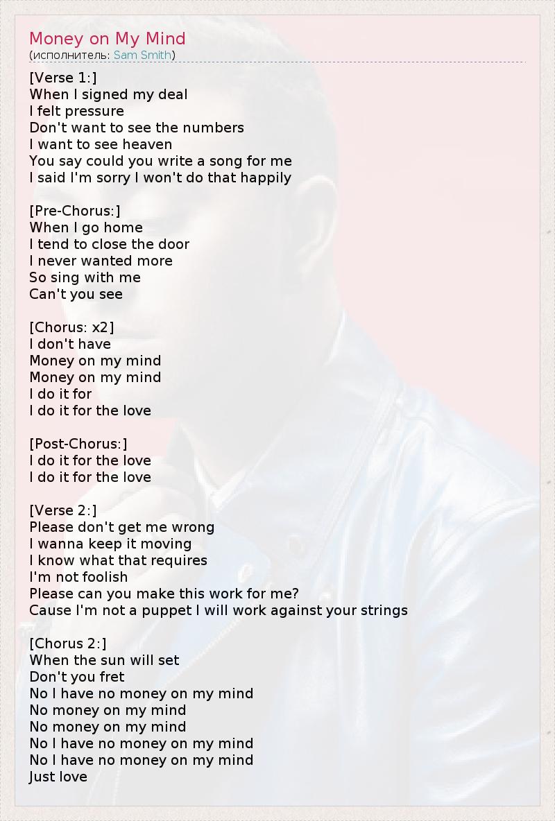 [1 куплет:] Когда я заключил сделку, 1 Я почувствовал давление. Я не хочу видеть все эти цифры, Я хочу видеть небо. Ты спрашиваешь: "Можешь написать для меня песню?" Я отвечаю: "Извини, но, к счастью, я не стану этого делать". [Связка:] Когда я приду домой, Я закрою за собой дверь. О большем я не мечтаю. Пой со мной, Неужели ты не понимаешь: [Припев: x2] У меня никогда не было Денег на уме, Денег на уме. Я делаю это, Я делаю это по любви. [Переход:] Я делаю это по любви, Я делаю это по любви. [2 куплет:] Прошу, не пойми меня неправильно: Я хочу, чтобы всё это продолжалось, Я знаю, чего это стоит. Я не глуп. Ты можешь сделать это для меня? Потому что я не кукла, чтобы дергать меня за веревочки. [2 припев:] Когда зайдет солнце, Не переживай. Нет, у меня и в мыслях не было денег. У меня и в мыслях не было денег, У меня и в мыслях не было денег. Нет, у меня и в мыслях не было денег, Нет, у меня и в мыслях не было денег. Только любовь. 1 – Имеется в виду контракт, который Сэм Смит подписал со звукозаписывающим лейблом Capitol Records.