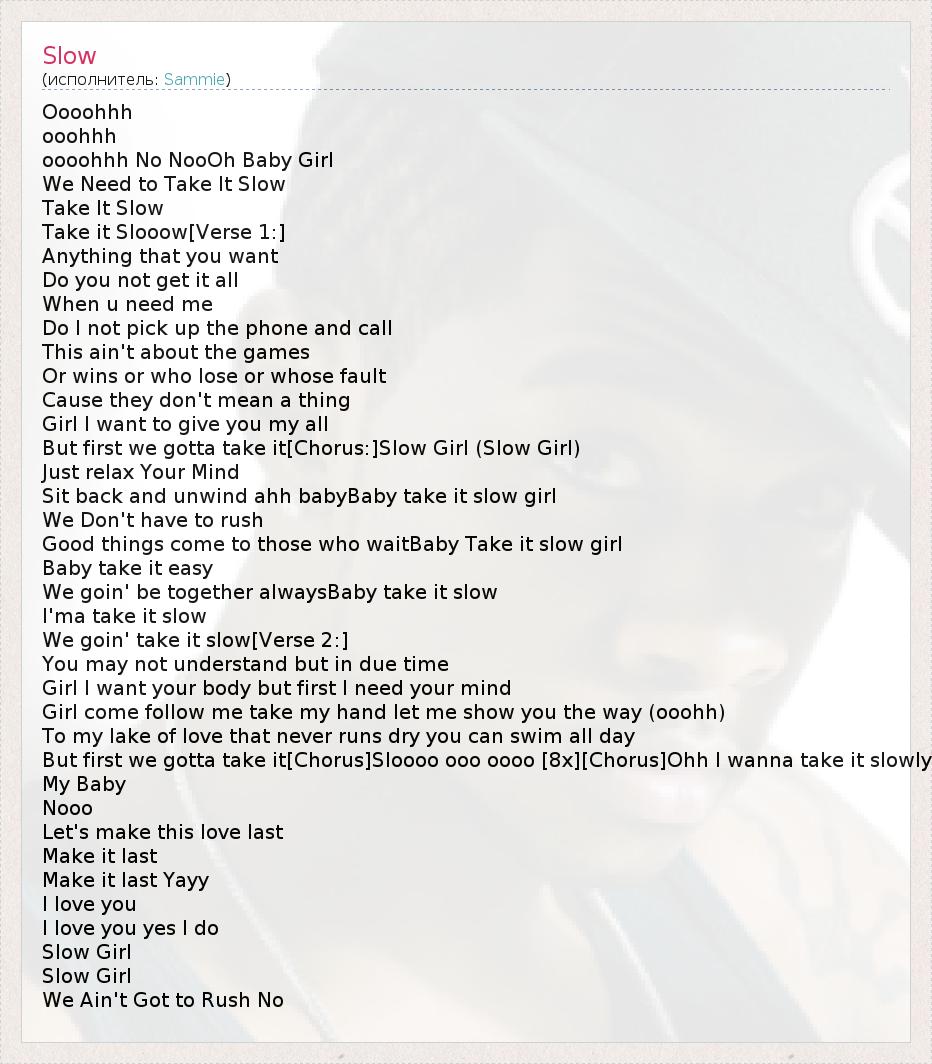 But first we gotta take it[Chorus]Sloooo ooo oooo [8x][Chorus]Ohh I wanna take it slowly