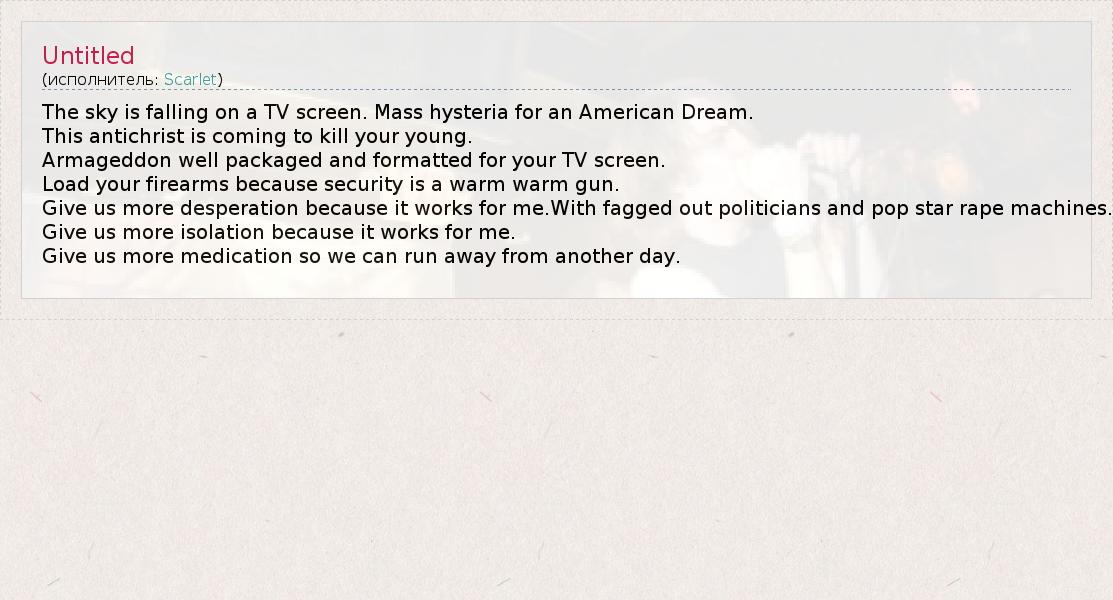 The sky is falling on a TV screen. Mass hysteria for an American Dream. This antichrist is coming to kill your young. Armageddon well packaged and formatted for your TV screen. Load your firearms because security is a warm warm gun. Give us more desperation because it works for me.With fagged out politicians and pop star rape machines. Give us more isolation because it works for me. Give us more medication so we can run away from another day.