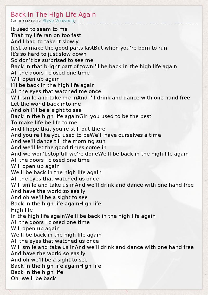 А как ты думаешь, о чем песня "Back In The High Life Again" ?