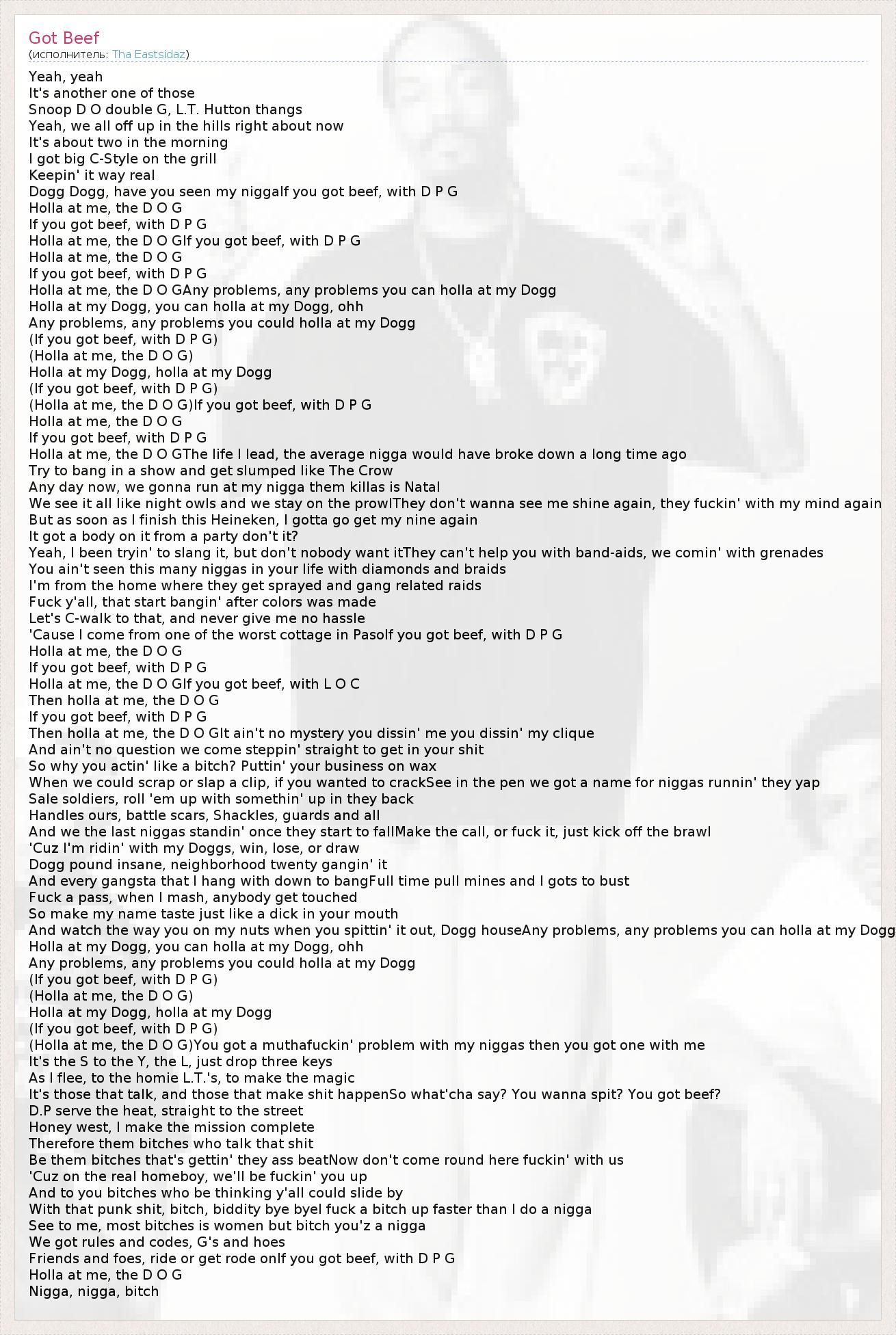 Yeah, yeah It's another one of those Snoop D O double G, L.T. Hutton thangs Yeah, we all off up in the hills right about now It's about two in the morning I got big C-Style on the grill Keepin' it way real Dogg Dogg, have you seen my niggaIf you got beef, with D P G Holla at me, the D O G If you got beef, with D P G Holla at me, the D O GIf you got beef, with D P G Holla at me, the D O G If you got beef, with D P G Holla at me, the D O GAny problems, any problems you can holla at my Dogg Holla at my Dogg, you can holla at my Dogg, ohh Any problems, any problems you could holla at my Dogg (If you got beef, with D P G) (Holla at me, the D O G) Holla at my Dogg, holla at my Dogg (If you got beef, with D P G) (Holla at me, the D O G)If you got beef, with D P G Holla at me, the D O G If you got beef, with D P G Holla at me, the D O GThe life I lead, the average nigga would have broke down a long time ago Try to bang in a show and get slumped like The Crow Any day now, we gonna run at my nigga them killas is Natal We see it all like night owls and we stay on the prowlThey don't wanna see me shine again, they fuckin' with my mind again But as soon as I finish this Heineken, I gotta go get my nine again It got a body on it from a party don't it? Yeah, I been tryin' to slang it, but don't nobody want itThey can't help you with band-aids, we comin' with grenades You ain't seen this many niggas in your life with diamonds and braids I'm from the home where they get sprayed and gang related raids Fuck y'all, that start bangin' after colors was made Let's C-walk to that, and never give me no hassle 'Cause I come from one of the worst cottage in PasoIf you got beef, with D P G Holla at me, the D O G If you got beef, with D P G Holla at me, the D O GIf you got beef, with L O C Then holla at me, the D O G If you got beef, with D P G Then holla at me, the D O GIt ain't no mystery you dissin' me you dissin' my clique And ain't no question we come steppin' straight to get in your shit So why you actin' like a bitch? Puttin' your business on wax When we could scrap or slap a clip, if you wanted to crackSee in the pen we got a name for niggas runnin' they yap Sale soldiers, roll 'em up with somethin' up in they back Handles ours, battle scars, Shackles, guards and all And we the last niggas standin' once they start to fallMake the call, or fuck it, just kick off the brawl 'Cuz I'm ridin' with my Doggs, win, lose, or draw Dogg pound insane, neighborhood twenty gangin' it And every gangsta that I hang with down to bangFull time pull mines and I gots to bust Fuck a pass, when I mash, anybody get touched So make my name taste just like a dick in your mouth And watch the way you on my nuts when you spittin' it out, Dogg houseAny problems, any problems you can holla at my Dogg Holla at my Dogg, you can holla at my Dogg, ohh Any problems, any problems you could holla at my Dogg (If you got beef, with D P G) (Holla at me, the D O G) Holla at my Dogg, holla at my Dogg (If you got beef, with D P G) (Holla at me, the D O G)You got a muthafuckin' problem with my niggas then you got one with me It's the S to the Y, the L, just drop three keys As I flee, to the homie L.T.'s, to make the magic It's those that talk, and those that make shit happenSo what'cha say? You wanna spit? You got beef? D.P serve the heat, straight to the street Honey west, I make the mission complete Therefore them bitches who talk that shit Be them bitches that's gettin' they ass beatNow don't come round here fuckin' with us 'Cuz on the real homeboy, we'll be fuckin' you up And to you bitches who be thinking y'all could slide by With that punk shit, bitch, biddity bye byeI fuck a bitch up faster than I do a nigga See to me, most bitches is women but bitch you'z a nigga We got rules and codes, G's and hoes Friends and foes, ride or get rode onIf you got beef, with D P G Holla at me, the D O G Nigga, nigga, bitch