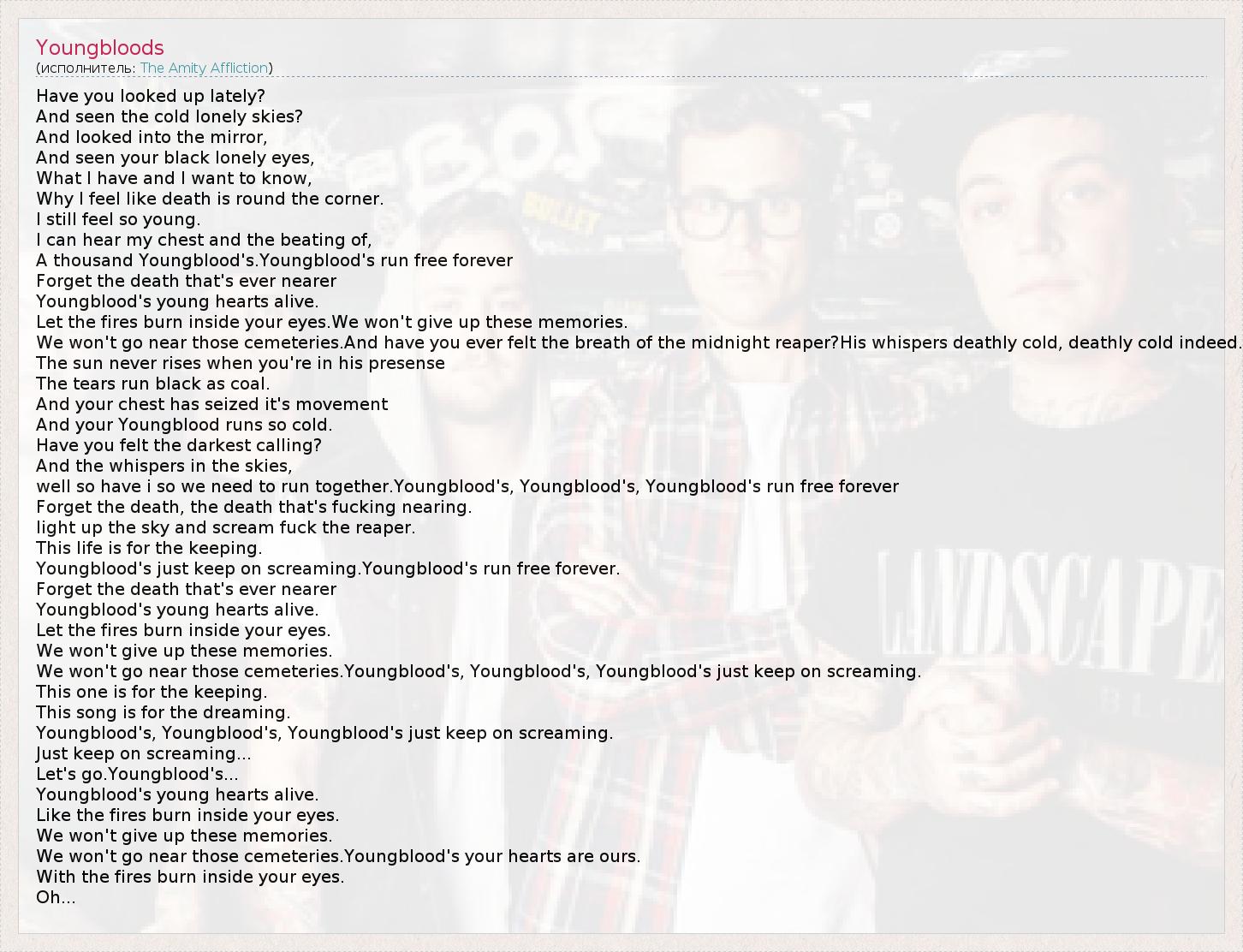 Have you looked up lately? And seen the cold lonely skies? And looked into the mirror, And seen your black lonely eyes, What I have and I want to know, Why I feel like death is round the corner. I still feel so young. I can hear my chest and the beating of, A thousand Youngblood's.Youngblood's run free forever Forget the death that's ever nearer Youngblood's young hearts alive. Let the fires burn inside your eyes.We won't give up these memories. We won't go near those cemeteries.And have you ever felt the breath of the midnight reaper?His whispers deathly cold, deathly cold indeed. The sun never rises when you're in his presense The tears run black as coal. And your chest has seized it's movement And your Youngblood runs so cold. Have you felt the darkest calling? And the whispers in the skies, well so have i so we need to run together.Youngblood's, Youngblood's, Youngblood's run free forever Forget the death, the death that's fucking nearing. light up the sky and scream fuck the reaper. This life is for the keeping. Youngblood's just keep on screaming.Youngblood's run free forever. Forget the death that's ever nearer Youngblood's young hearts alive. Let the fires burn inside your eyes. We won't give up these memories. We won't go near those cemeteries.Youngblood's, Youngblood's, Youngblood's just keep on screaming. This one is for the keeping. This song is for the dreaming. Youngblood's, Youngblood's, Youngblood's just keep on screaming. Just keep on screaming... Let's go.Youngblood's... Youngblood's young hearts alive. Like the fires burn inside your eyes. We won't give up these memories. We won't go near those cemeteries.Youngblood's your hearts are ours. With the fires burn inside your eyes. Oh...