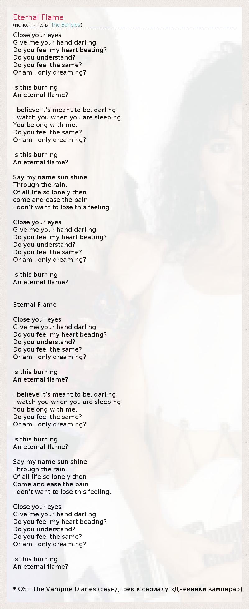 Close your eyes Give me your hand darling Do you feel my heart beating? Do you understand? Do you feel the same? Or am I only dreaming? Is this burning An eternal flame? I believe it's meant to be, darling I watch you when you are sleeping You belong with me. Do you feel the same? Or am I only dreaming? Is this burning An eternal flame? Say my name sun shine Through the rain. Of all life so lonely then come and ease the pain I don't want to lose this feeling. Close your eyes Give me your hand darling Do you feel my heart beating? Do you understand? Do you feel the same? Or am I only dreaming? Is this burning An eternal flame? Eternal Flame Close your eyes Give me your hand darling Do you feel my heart beating? Do you understand? Do you feel the same? Or am I only dreaming? Is this burning An eternal flame? I believe it's meant to be, darling I watch you when you are sleeping You belong with me. Do you feel the same? Or am I only dreaming? Is this burning An eternal flame? Say my name sun shine Through the rain. Of all life so lonely then Come and ease the pain I don't want to lose this feeling. Close your eyes Give me your hand darling Do you feel my heart beating? Do you understand? Do you feel the same? Or am I only dreaming? Is this burning An eternal flame? * OST The Vampire Diaries (саундтрек к сериалу «Дневники вампира»)