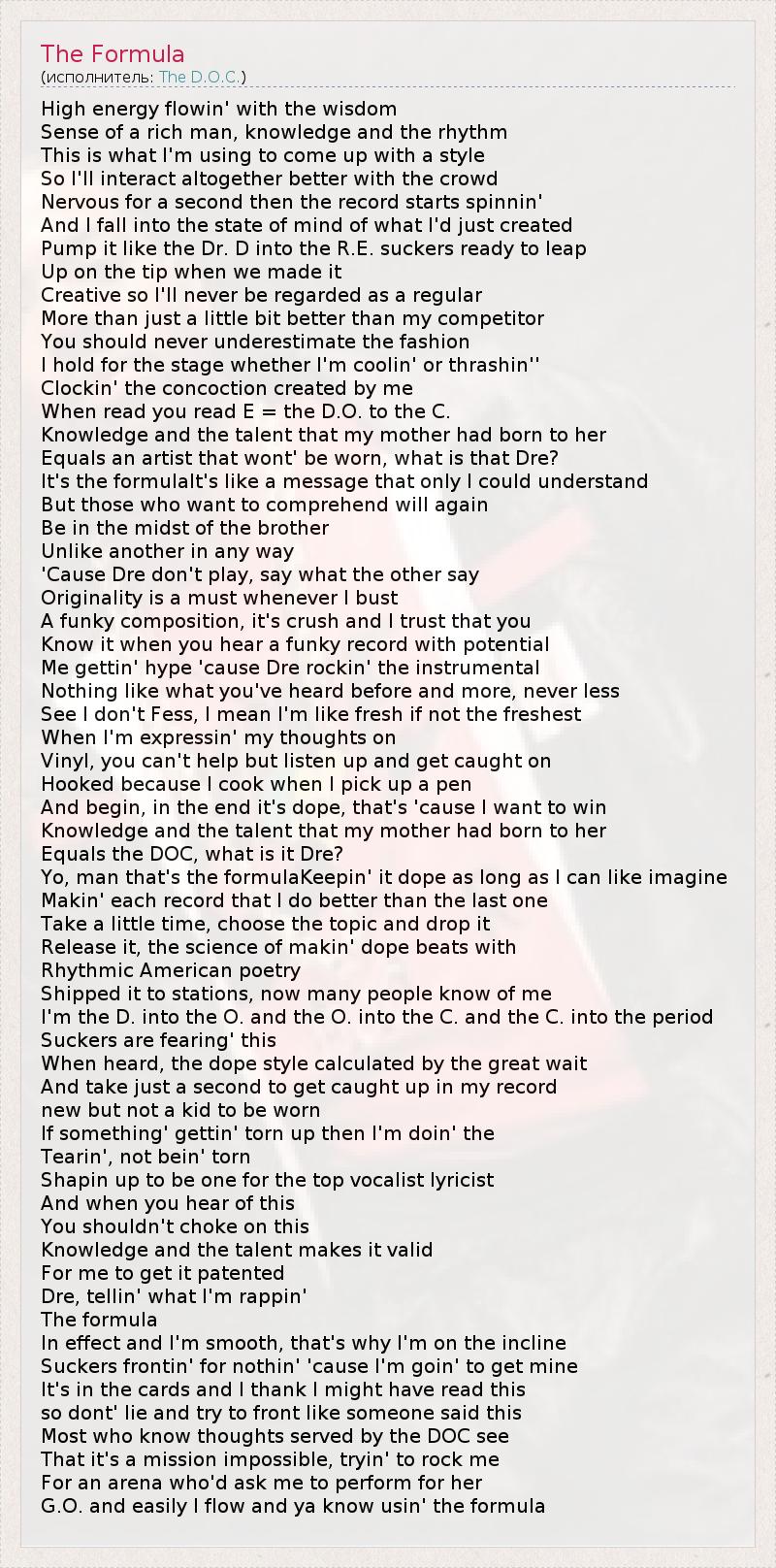 Это интересно:The D.O.C. (Tracy Lynn Curry) - родился 10 июня 1968 года в Хьюстоне, позже перебрался в Даллас. The D.O.C. присоединился к N.W.A в 1986 году как рэппер. После первого альбома группы "N.W.A and the Posse" он покидает группу. Однако, после того, как Ice Cube покинул группу в 1987 году, некому было больше сочинять тексты и The D.O.C. возвращается в коллектив как сочинитель. Трэйси стал автором текстов... продолжение