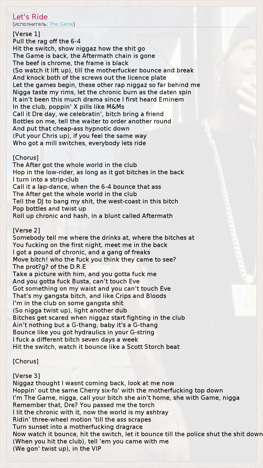 Это интересно:Джейсон Тейлор (AKA The Game) родился 27 ноября 1979 года прославленном пригороде Лос-Анджелеса, Комптоне. Прозвище Game («игра») музыканту дала бабушка, мотивируя это тем, что внук постоянно в игре – от баскетбола и велосипеда до музыки «игр» между уличными бандами. Семейные проблемы, связанные с изнасилованием сестры рэппера его отцом, заставили провести его в детском доме с 3 по 9 класс. «Мое детство... продолжение