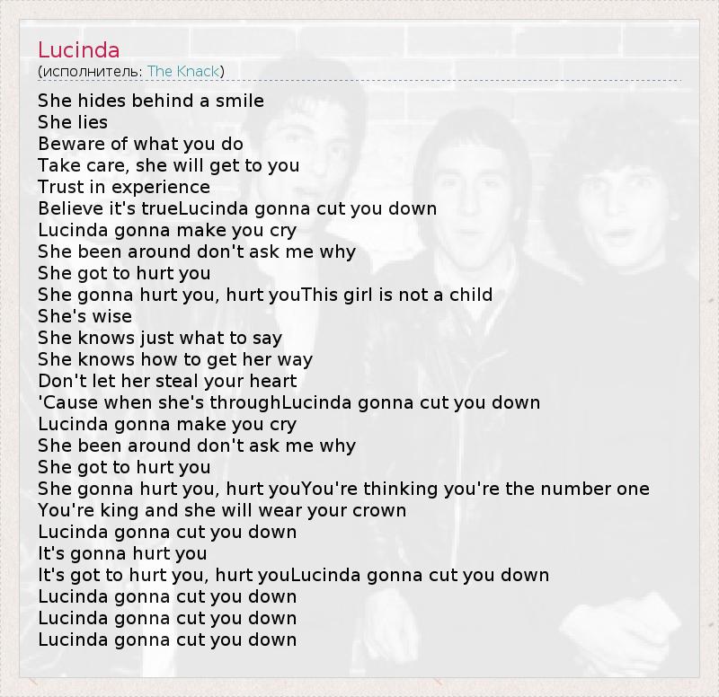 It's got to hurt you, hurt youLucinda gonna cut you down