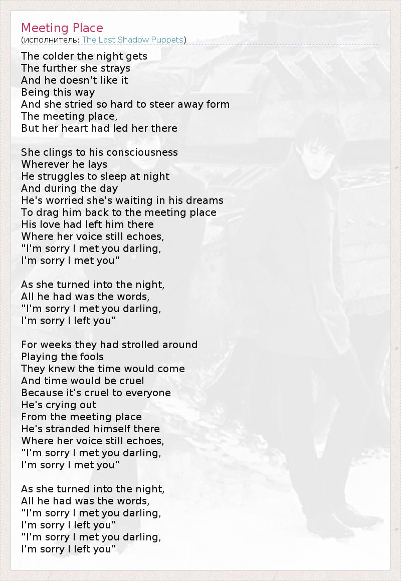 The colder the night gets The further she strays And he doesn't like it Being this way And she stried so hard to steer away form The meeting place, But her heart had led her there She clings to his consciousness Wherever he lays He struggles to sleep at night And during the day He's worried she's waiting in his dreams To drag him back to the meeting place His love had left him there Where her voice still echoes, "I'm sorry I met you darling, I'm sorry I met you" As she turned into the night, All he had was the words, "I'm sorry I met you darling, I'm sorry I left you" For weeks they had strolled around Playing the fools They knew the time would come And time would be cruel Because it's cruel to everyone He's crying out From the meeting place He's stranded himself there Where her voice still echoes, "I'm sorry I met you darling, I'm sorry I met you" As she turned into the night, All he had was the words, "I'm sorry I met you darling, I'm sorry I left you" "I'm sorry I met you darling, I'm sorry I left you"