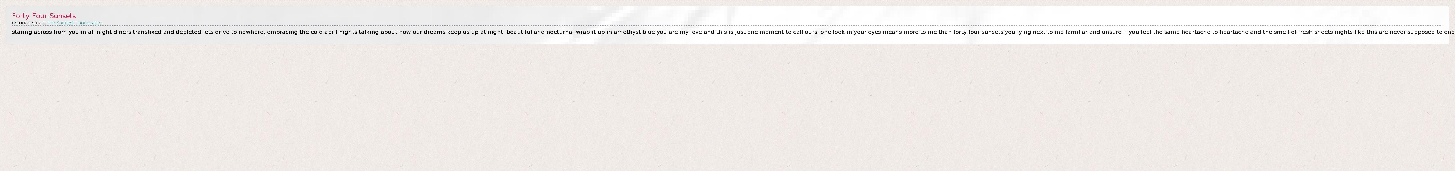 staring across from you in all night diners transfixed and depleted lets drive to nowhere, embracing the cold april nights talking about how our dreams keep us up at night. beautiful and nocturnal wrap it up in amethyst blue you are my love and this is just one moment to call ours. one look in your eyes means more to me than forty four sunsets you lying next to me familiar and unsure if you feel the same heartache to heartache and the smell of fresh sheets nights like this are never supposed to end