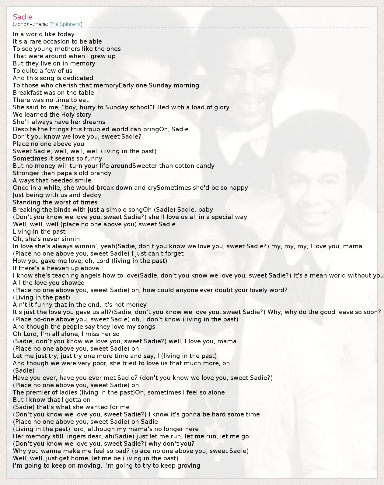 In love she's always winnin', yeah(Sadie, don't you know we love you, sweet Sadie?) my, my, my, I love you, mama