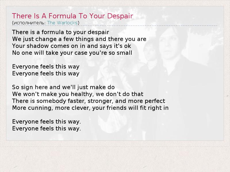 There is a formula to your despair We just change a few things and there you are Your shadow comes on in and says it's ok No one will take your case you're so small Everyone feels this way Everyone feels this way So sign here and we'll just make do We won't make you healthy, we don't do that There is somebody faster, stronger, and more perfect More cunning, more clever, your friends will fit right in Everyone feels this way. Everyone feels this way.