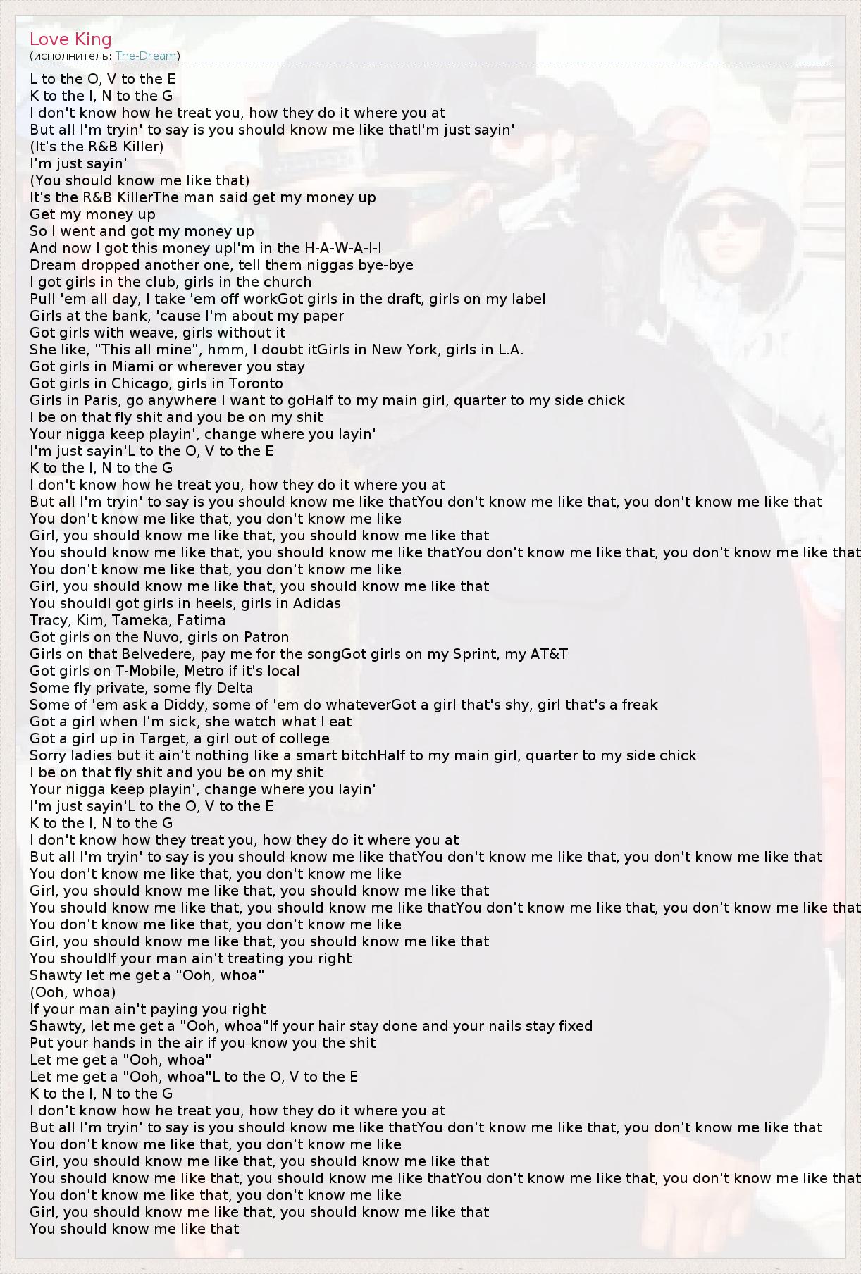 L to the O, V to the E K to the I, N to the G I don't know how he treat you, how they do it where you at But all I'm tryin' to say is you should know me like thatI'm just sayin' (It's the R&B Killer) I'm just sayin' (You should know me like that) It's the R&B KillerThe man said get my money up Get my money up So I went and got my money up And now I got this money upI'm in the H-A-W-A-I-I Dream dropped another one, tell them niggas bye-bye I got girls in the club, girls in the church Pull 'em all day, I take 'em off workGot girls in the draft, girls on my label Girls at the bank, 'cause I'm about my paper Got girls with weave, girls without it She like, "This all mine", hmm, I doubt itGirls in New York, girls in L.A. Got girls in Miami or wherever you stay Got girls in Chicago, girls in Toronto Girls in Paris, go anywhere I want to goHalf to my main girl, quarter to my side chick I be on that fly shit and you be on my shit Your nigga keep playin', change where you layin' I'm just sayin'L to the O, V to the E K to the I, N to the G I don't know how he treat you, how they do it where you at But all I'm tryin' to say is you should know me like thatYou don't know me like that, you don't know me like that You don't know me like that, you don't know me like Girl, you should know me like that, you should know me like that You should know me like that, you should know me like thatYou don't know me like that, you don't know me like that You don't know me like that, you don't know me like Girl, you should know me like that, you should know me like that You shouldI got girls in heels, girls in Adidas Tracy, Kim, Tameka, Fatima Got girls on the Nuvo, girls on Patron Girls on that Belvedere, pay me for the songGot girls on my Sprint, my AT&T Got girls on T-Mobile, Metro if it's local Some fly private, some fly Delta Some of 'em ask a Diddy, some of 'em do whateverGot a girl that's shy, girl that's a freak Got a girl when I'm sick, she watch what I eat Got a girl up in Target, a girl out of college Sorry ladies but it ain't nothing like a smart bitchHalf to my main girl, quarter to my side chick I be on that fly shit and you be on my shit Your nigga keep playin', change where you layin' I'm just sayin'L to the O, V to the E K to the I, N to the G I don't know how they treat you, how they do it where you at But all I'm tryin' to say is you should know me like thatYou don't know me like that, you don't know me like that You don't know me like that, you don't know me like Girl, you should know me like that, you should know me like that You should know me like that, you should know me like thatYou don't know me like that, you don't know me like that You don't know me like that, you don't know me like Girl, you should know me like that, you should know me like that You shouldIf your man ain't treating you right Shawty let me get a "Ooh, whoa" (Ooh, whoa) If your man ain't paying you right Shawty, let me get a "Ooh, whoa"If your hair stay done and your nails stay fixed Put your hands in the air if you know you the shit Let me get a "Ooh, whoa" Let me get a "Ooh, whoa"L to the O, V to the E K to the I, N to the G I don't know how he treat you, how they do it where you at But all I'm tryin' to say is you should know me like thatYou don't know me like that, you don't know me like that You don't know me like that, you don't know me like Girl, you should know me like that, you should know me like that You should know me like that, you should know me like thatYou don't know me like that, you don't know me like that You don't know me like that, you don't know me like Girl, you should know me like that, you should know me like that You should know me like that
