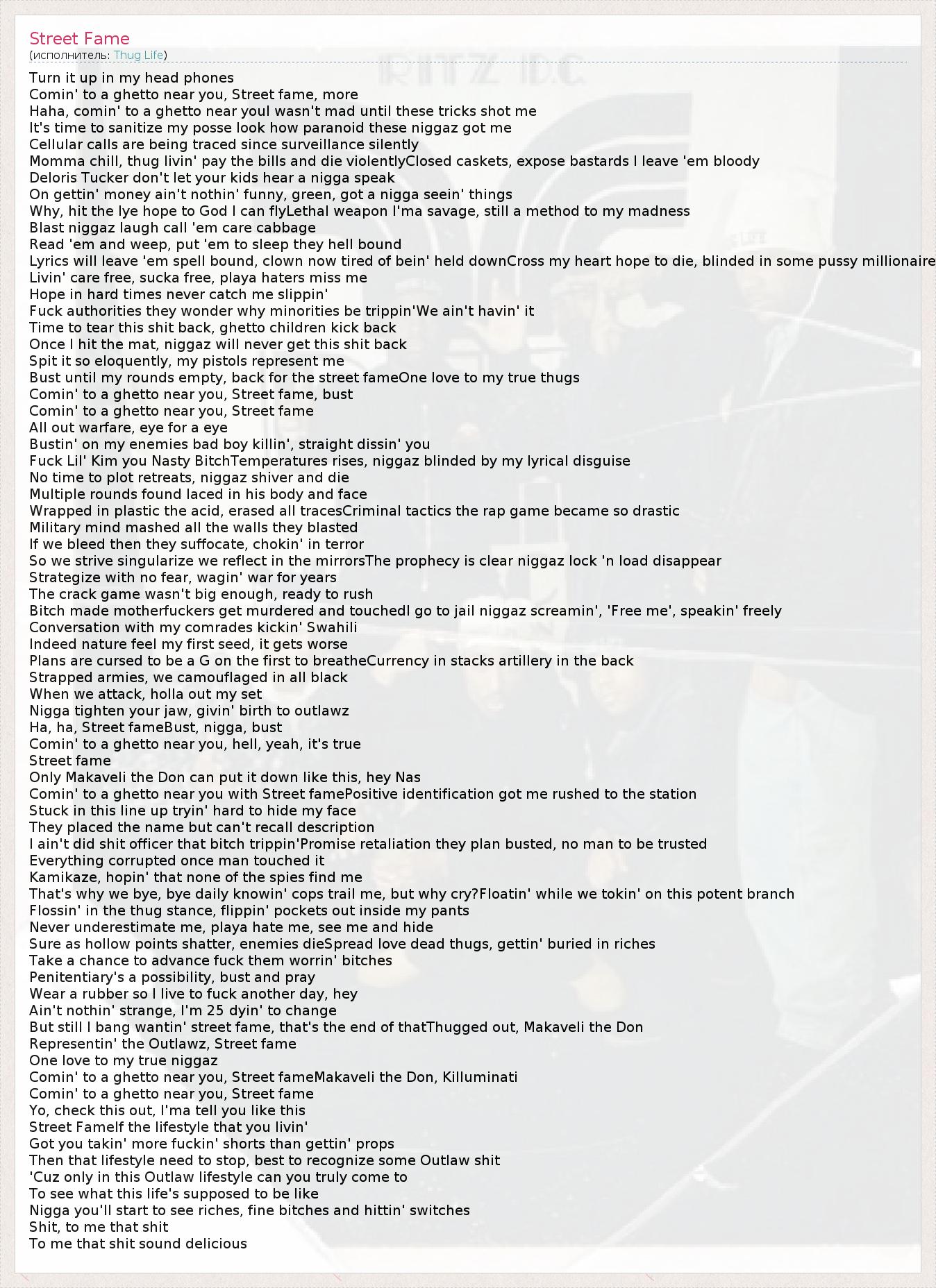 Это интересно:Группа Thug Life была образована рэппером Тупаком Шакуром. Первым релизом группы стал альбом под названием Thug Life: Volume 1. Он был издан 26 сентября 1994 года на лэйбле Тупака Out Da Gutta Records. Альбом достиг золотого статуса. Из-за сильной критики гангста-рэпа в начале 90-х оригинальная версия альбома была подвержена цензуре и большинство трэков были переписаны. Говорят, что Тупак сделал еще две альтернативные... продолжение