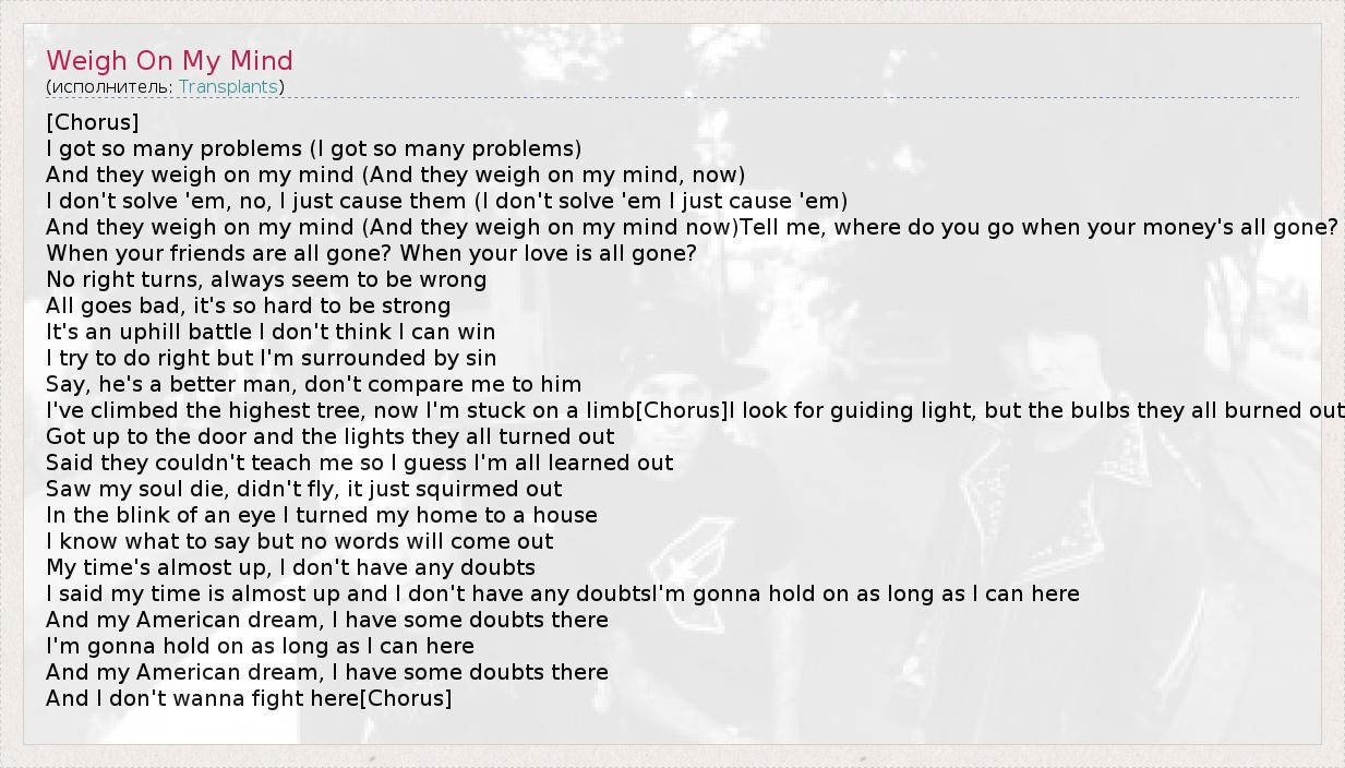 А как ты думаешь, о чем песня "Weigh On My Mind" ?