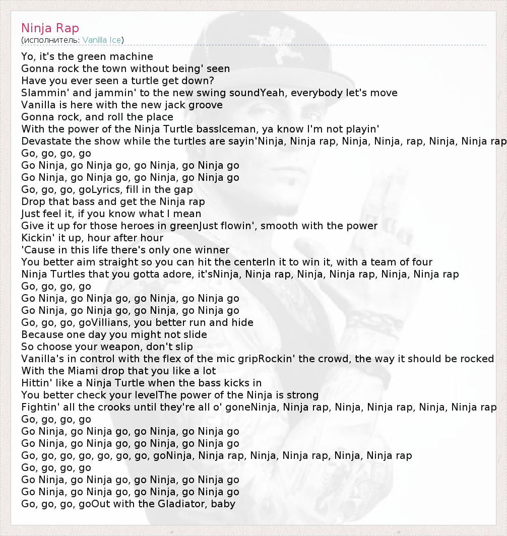 Yo, it's the green machine Gonna rock the town without being' seen Have you ever seen a turtle get down? Slammin' and jammin' to the new swing soundYeah, everybody let's move Vanilla is here with the new jack groove Gonna rock, and roll the place With the power of the Ninja Turtle bassIceman, ya know I'm not playin' Devastate the show while the turtles are sayin'Ninja, Ninja rap, Ninja, Ninja, rap, Ninja, Ninja rap Go, go, go, go Go Ninja, go Ninja go, go Ninja, go Ninja go Go Ninja, go Ninja go, go Ninja, go Ninja go Go, go, go, goLyrics, fill in the gap Drop that bass and get the Ninja rap Just feel it, if you know what I mean Give it up for those heroes in greenJust flowin', smooth with the power Kickin' it up, hour after hour 'Cause in this life there's only one winner You better aim straight so you can hit the centerIn it to win it, with a team of four Ninja Turtles that you gotta adore, it'sNinja, Ninja rap, Ninja, Ninja rap, Ninja, Ninja rap Go, go, go, go Go Ninja, go Ninja go, go Ninja, go Ninja go Go Ninja, go Ninja go, go Ninja, go Ninja go Go, go, go, goVillians, you better run and hide Because one day you might not slide So choose your weapon, don't slip Vanilla's in control with the flex of the mic gripRockin' the crowd, the way it should be rocked With the Miami drop that you like a lot Hittin' like a Ninja Turtle when the bass kicks in You better check your levelThe power of the Ninja is strong Fightin' all the crooks until they're all o' goneNinja, Ninja rap, Ninja, Ninja rap, Ninja, Ninja rap Go, go, go, go Go Ninja, go Ninja go, go Ninja, go Ninja go Go Ninja, go Ninja go, go Ninja, go Ninja go Go, go, go, go, go, go, go, goNinja, Ninja rap, Ninja, Ninja rap, Ninja, Ninja rap Go, go, go, go Go Ninja, go Ninja go, go Ninja, go Ninja go Go Ninja, go Ninja go, go Ninja, go Ninja go Go, go, go, goOut with the Gladiator, baby
