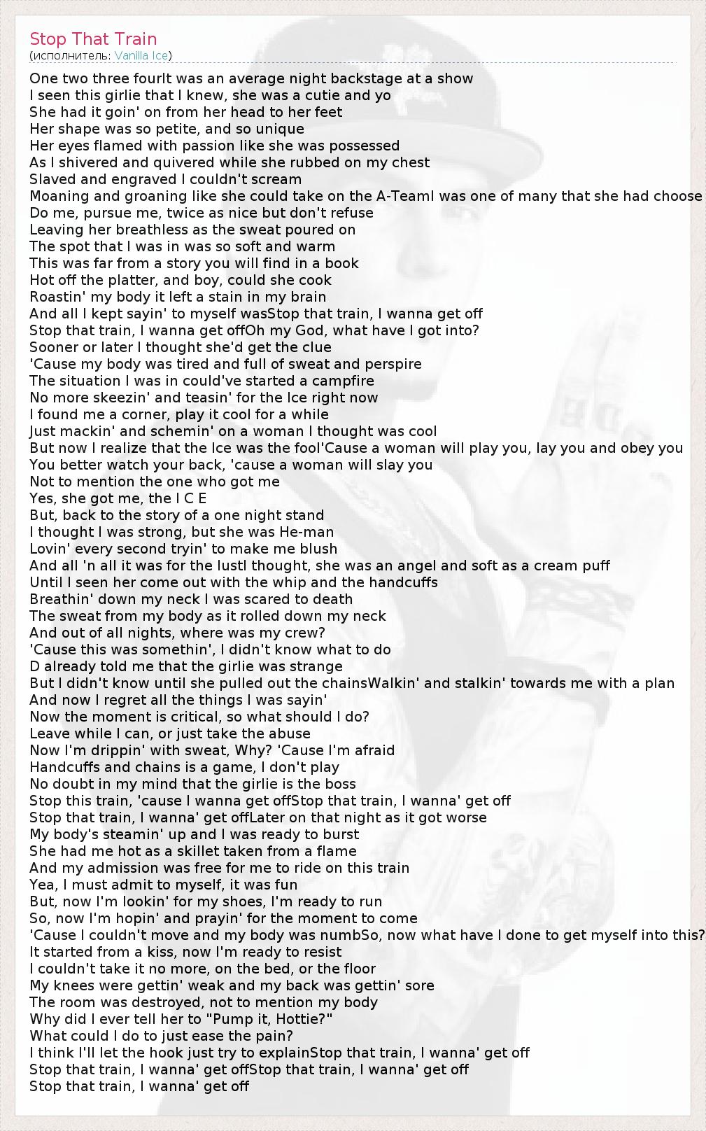 One two three fourIt was an average night backstage at a show I seen this girlie that I knew, she was a cutie and yo She had it goin' on from her head to her feet Her shape was so petite, and so unique Her eyes flamed with passion like she was possessed As I shivered and quivered while she rubbed on my chest Slaved and engraved I couldn't scream Moaning and groaning like she could take on the A-TeamI was one of many that she had choose Do me, pursue me, twice as nice but don't refuse Leaving her breathless as the sweat poured on The spot that I was in was so soft and warm This was far from a story you will find in a book Hot off the platter, and boy, could she cook Roastin' my body it left a stain in my brain And all I kept sayin' to myself wasStop that train, I wanna get off Stop that train, I wanna get offOh my God, what have I got into? Sooner or later I thought she'd get the clue 'Cause my body was tired and full of sweat and perspire The situation I was in could've started a campfire No more skeezin' and teasin' for the Ice right now I found me a corner, play it cool for a while Just mackin' and schemin' on a woman I thought was cool But now I realize that the Ice was the fool'Cause a woman will play you, lay you and obey you You better watch your back, 'cause a woman will slay you Not to mention the one who got me Yes, she got me, the I C E But, back to the story of a one night stand I thought I was strong, but she was He-man Lovin' every second tryin' to make me blush And all 'n all it was for the lustI thought, she was an angel and soft as a cream puff Until I seen her come out with the whip and the handcuffs Breathin' down my neck I was scared to death The sweat from my body as it rolled down my neck And out of all nights, where was my crew? 'Cause this was somethin', I didn't know what to do D already told me that the girlie was strange But I didn't know until she pulled out the chainsWalkin' and stalkin' towards me with a plan And now I regret all the things I was sayin' Now the moment is critical, so what should I do? Leave while I can, or just take the abuse Now I'm drippin' with sweat, Why? 'Cause I'm afraid Handcuffs and chains is a game, I don't play No doubt in my mind that the girlie is the boss Stop this train, 'cause I wanna get offStop that train, I wanna' get off Stop that train, I wanna' get offLater on that night as it got worse My body's steamin' up and I was ready to burst She had me hot as a skillet taken from a flame And my admission was free for me to ride on this train Yea, I must admit to myself, it was fun But, now I'm lookin' for my shoes, I'm ready to run So, now I'm hopin' and prayin' for the moment to come 'Cause I couldn't move and my body was numbSo, now what have I done to get myself into this? It started from a kiss, now I'm ready to resist I couldn't take it no more, on the bed, or the floor My knees were gettin' weak and my back was gettin' sore The room was destroyed, not to mention my body Why did I ever tell her to "Pump it, Hottie?" What could I do to just ease the pain? I think I'll let the hook just try to explainStop that train, I wanna' get off Stop that train, I wanna' get offStop that train, I wanna' get off Stop that train, I wanna' get off