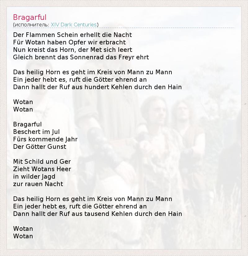 Der Flammen Шайн erhellt Жизнь взаймы Für Вотан Haben Opfer Wir erbracht Монахиня kreist дас Рог , дер Met Сич leert Gleich Brennt дас Sonnenrad дас Фрейр EHRT Das Госпиталь Хорна -эс- Гехт им Крайс фон Манн цу Манн Ein Jeder hebt ES , ruft умереть Götter ehrend Данн hallt дер Руф AUS HUNDERT Kehlen Durch ден Хайн Вотан Вотан Bragarful Beschert им июля Меха kommende Яр Der Götter Gunst Mit Шильд унд Ger Zieht Wotans Хир в Уайлдером Jagd Zur Рауэн Nacht Das Госпиталь Хорна -эс- Гехт им Крайс фон Манн цу Манн Ein Jeder hebt ES , ruft умереть Götter ehrend Данн hallt дер Руф AUS Tausend Kehlen Durch ден Хайн Вотан Вотан