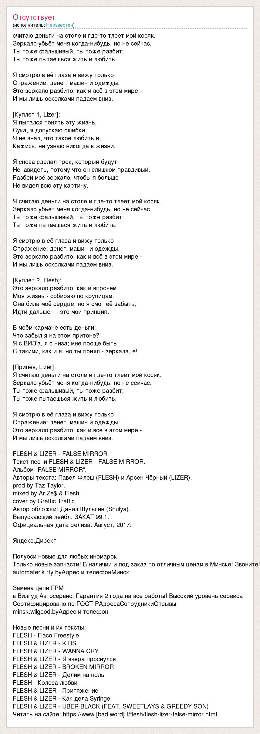 считаю деньги на столе и где-то тлеет мой косяк. Зеркало убьёт меня когда-нибудь, но не сейчас. Ты тоже фальшивый, ты тоже разбит; Ты тоже пытаешься жить и любить. Я смотрю в её глаза и вижу только Отражение: денег, машин и одежды. Это зеркало разбито, как и всё в этом мире - И мы лишь осколками падаем вниз. [Куплет 1, Lizer]: Я пытался понять эту жизнь, Сука, я допускаю ошибки. Я не знал, что такое любить и, Кажись, не узнаю никогда в жизни. Я снова сделал трек, который будут Ненавидеть, потому что он слишком правдивый. Разбей моё зеркало, чтобы я больше Не видел всю эту картину. Я считаю деньги на столе и где-то тлеет мой косяк. Зеркало убьёт меня когда-нибудь, но не сейчас. Ты тоже фальшивый, ты тоже разбит; Ты тоже пытаешься жить и любить. Я смотрю в её глаза и вижу только Отражение: денег, машин и одежды. Это зеркало разбито, как и всё в этом мире - И мы лишь осколками падаем вниз. [Куплет 2, Flesh]: Это зеркало разбито, как и впрочем Моя жизнь - собираю по крупицам. Она била моё сердце, но я смог её забыть; Идти дальше — это мой принцип. В моём кармане есть деньги; Что забыл я на этом притоне? Я с ВИЗ’а, я с низа; мне проще быть С такими, как и я, но ты понял - зеркала, e! [Припев, Lizer]: Я считаю деньги на столе и где-то тлеет мой косяк. Зеркало убьёт меня когда-нибудь, но не сейчас. Ты тоже фальшивый, ты тоже разбит; Ты тоже пытаешься жить и любить. Я смотрю в её глаза и вижу только Отражение: денег, машин и одежды. Это зеркало разбито, как и всё в этом мире - И мы лишь осколками падаем вниз. FLESH & LIZER - FALSE MIRROR Текст песни FLESH & LIZER - FALSE MIRROR. Альбом "FALSE MIRROR". Авторы текста: Павел Флеш (FLESH) и Арсен Чёрный (LIZER). prod by Taz Taylor. mixed by Ar.Ze$ & Flesh. cover by Graffic Traffic. Автор обложки: Данил Шульгин (Shulya). Выпускающий лейбл: ЗАКАТ 99.1. Официальная дата релиза: Август, 2017. Яндекс.Директ Полуоси новые для любых иномарок Только новые запчасти! В наличии и под заказ по отличным ценам в Минске! Звоните! automaterik.rty.byАдрес и телефонМинск Замена цепи ГРМ в Вилгуд Автосервис. Гарантия 2 года на все работы! Высокий уровень сервиса Сертифицировано по ГОСТ-РАдресаСотрудникиОтзывы minsk.wilgood.byАдрес и телефон Новые песни и их тексты: FLESH - Flaco Freestyle FLESH & LIZER - KIDS FLESH & LIZER - WANNA CRY FLESH & LIZER - Я вчера проснулся FLESH & LIZER - BROKEN MIRROR FLESH & LIZER - Делим на ноль FLESH - Колеса любви FLESH & LIZER - Притяжение FLESH & LIZER - Как дела Syringe FLESH & LIZER - UBER BLACK (FEAT. SWEETLAYS & GREEDY SON) Читать на сайте: https://www [bad word] f/flesh/flesh-lizer-false-mirror.html